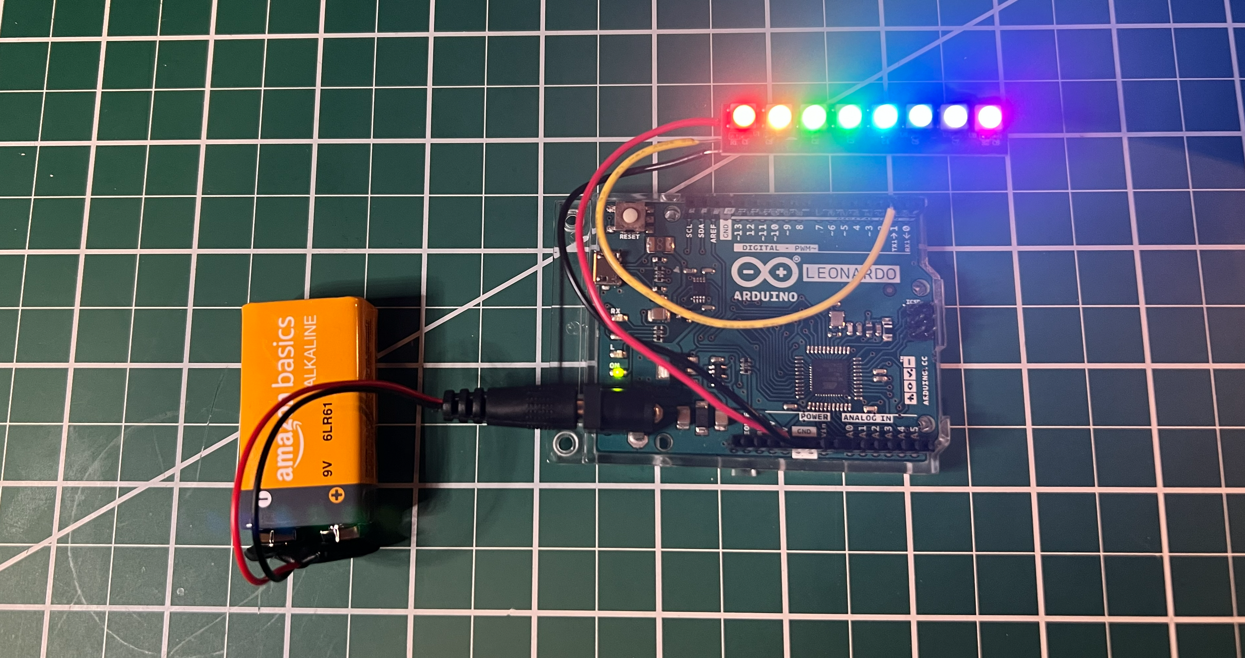 }As you turn the potentiometer, you should see all 8 LEDs smoothly cycle through the rainbow together.